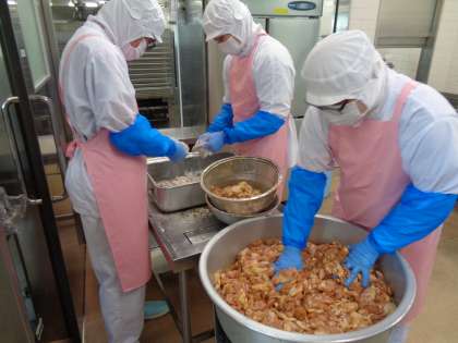 鶏のから揚げに薄力粉と片栗粉をつけています。