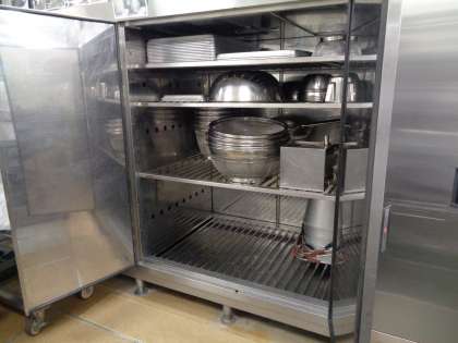 中は下の写真のようになっていて、スイッチを入れると庫内が90度くらいまで上がり、調理器具や食器を温めることで消毒しています。