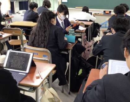 2年生の英語の授業で、Teamsの音読の練習を使って、スピーキングの練習をしました。