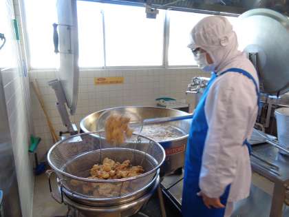 この後、バットに配缶して手作りの甘辛いタレをかけました。