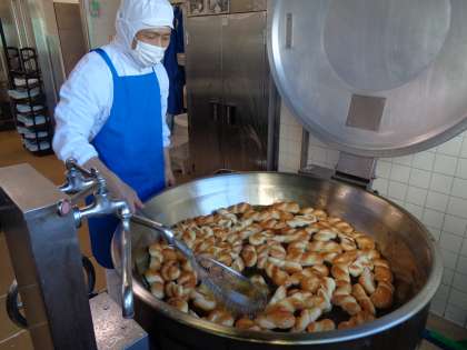 揚げパンに使うパンを揚げています。