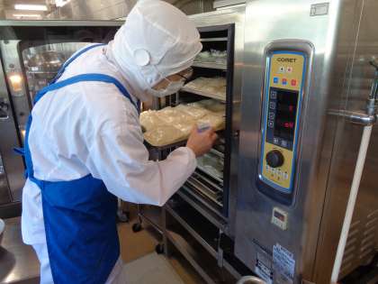 袋入りのソフトめんは穴あきの鉄板に並べ、スチームコンベクションオーブンで27〜30分蒸しました。