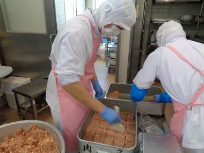 30個分のタネの重さを量ってバットに入れ、ヘラで30等分の線を入れてから成形することで、1つ1つの大きさをできるだけ均等にしています。