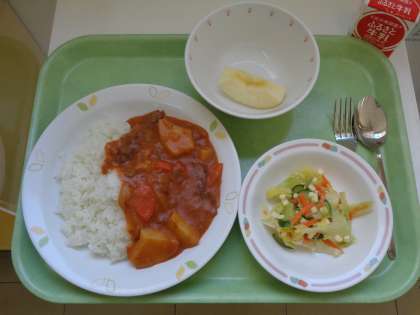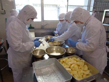 2校分で155個のりんごの皮をむき、褐変防止のため塩水につけてから、バットに入れています。