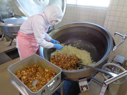 鶏肉は赤ワイン・カレー粉・塩で下味をつけてから、回転釜で炒めました。