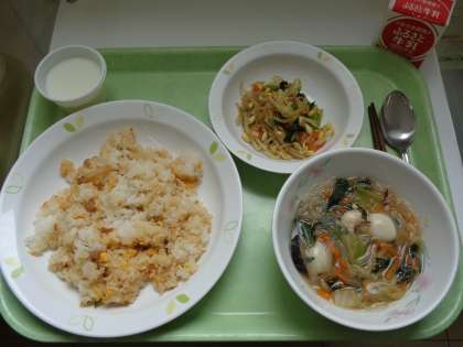 キムチチャーハンは炊きあがったごはんに具と炒り卵を混ぜて作ります。