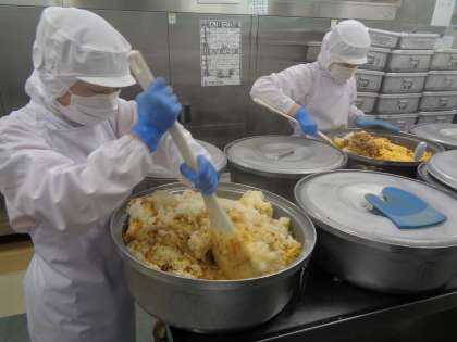 大きなしゃもじでムラがなくなるように混ぜていきます。