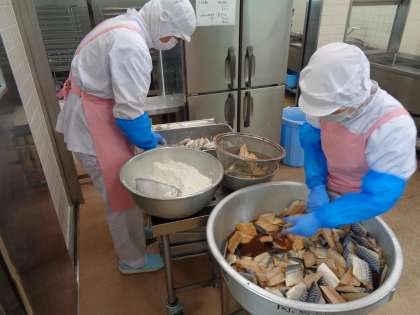 大きなタライで下味をつけ、ざるで汁気をきってから、粉をまぶしています。