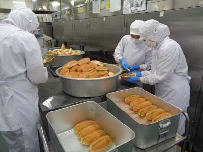 給食室でパンに切れ目を入れ、1つずつ丁寧にドライカレーをはさみました。