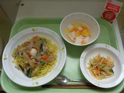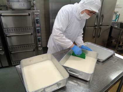給食室で作った寒天液をバットに流し、冷やし固めたら、ヘラを使ってさいの目にします。