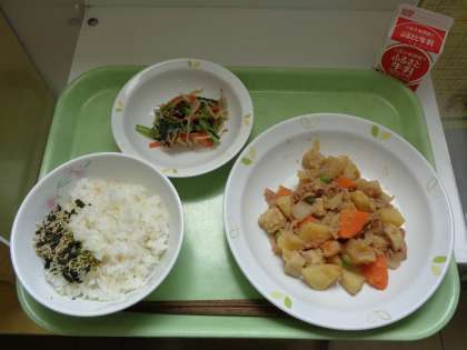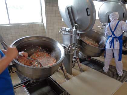 できあがり量が多いので、1校分で2つの回転釜を使って作ります。
