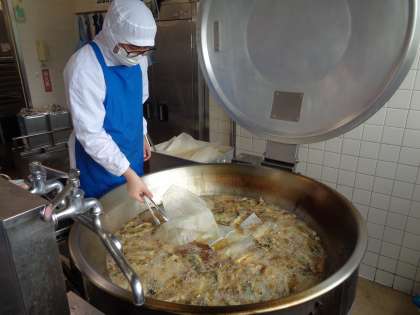 揚げている間、形をキープするためにオーブンシートに並べて、シートごと油に入れています。