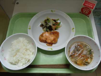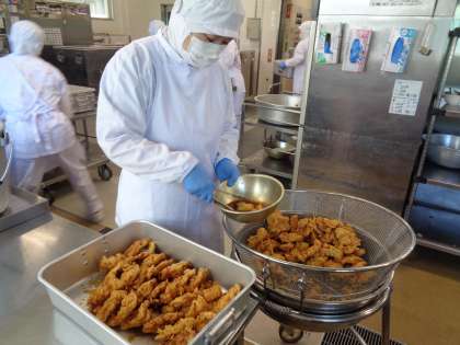 揚げた鶏肉に1つずつ甘酢をからめてからバットに入れ、仕上げにタルタルソースをかけます。