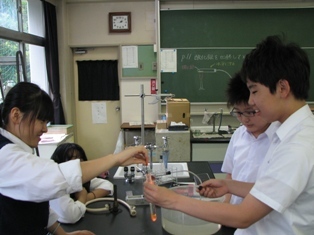 この時間は理科です。実験を通して「物質の成り立ち」を学習しています。