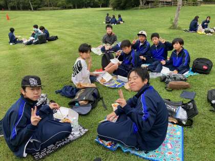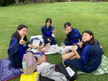 青木ヶ原樹海の班別トレッキング中です。こちらは、中間ゴール地点の野鳥の森公園でランチをいただいています。