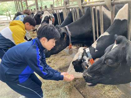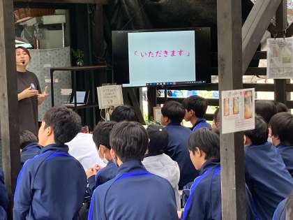 恒例の市の瀬牧場さんを訪問しています。酪農業のたいへんさと命の尊さについて教えていただきました。その後、乳牛への餌やりや搾乳体験、バター作りをしました。
