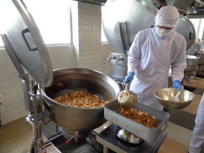はかりの上に食缶をのせ、1クラス分ずつ計量しています。