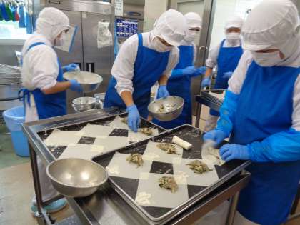 皮を並べる→具をのせる→水で溶いた薄力粉を塗る→具を包んで巻くとたくさんの工程があるため、複数人で分担して作っています。
