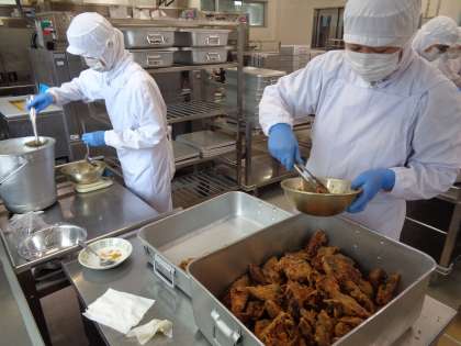 下味をつけて揚げたかつおにタレをからめてバットに並べます。