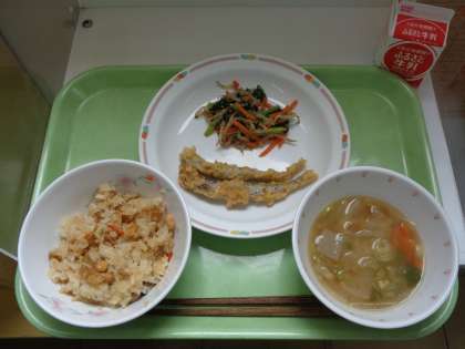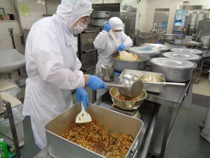 しめじ・まいたけ・エリンギを使った具をボウルに計量し、炊き上がったごはんに混ぜています。