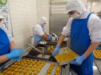 1つ分ずつに分けて丸めた後、上部を押してかぼちゃのような形にしています。