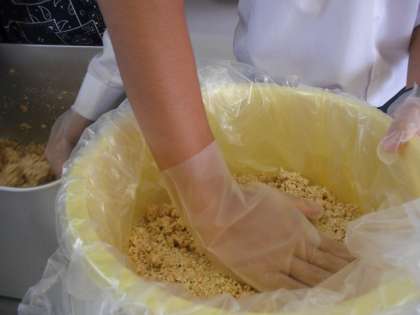 塩とこうじとつぶした大豆をまぜてタルにつめました。