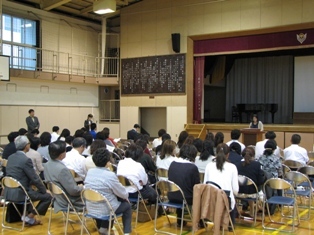 「9年教育」がテーマです。7つの分科会の後、小中の教員と学校協議会のみなさんが体育館に集まり全体会を行いました。