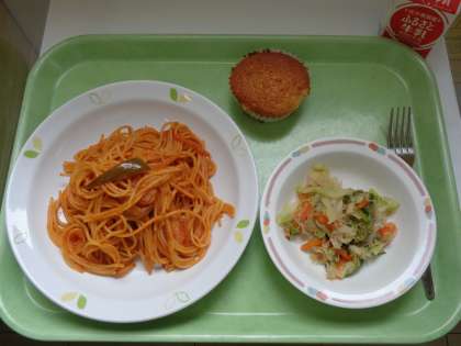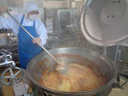 スパゲッティナポリタンはゆでたスパゲッティと具を回転釜で混ぜ合わせて作ります。