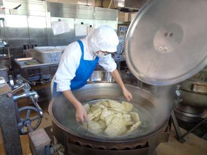 ザルごと熱湯の中に入れてゆでた後、水で冷やしてぬめりをとります。