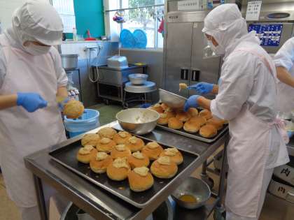 バター・卵・砂糖・すりごま・薄力粉を合わせて作った生地を等分にのせて、スプーンでぬりひろげます。