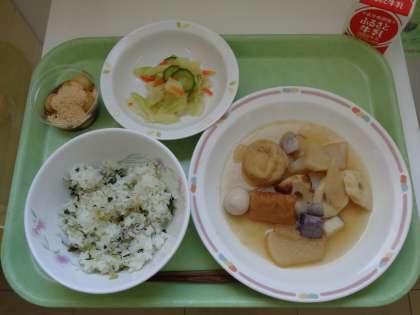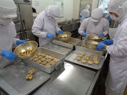ゆでた白玉と黒蜜を混ぜ合わせてからカップに入れ、上からきなこをかけます。