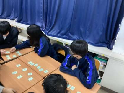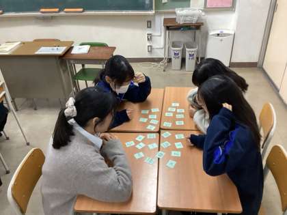 写真は、1年生で言葉のとらえ方を考えるカルタに取り組んでいる時の様子です。