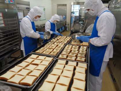 バター・砂糖・すりごまを混ぜ合わせたものを食パンの上に均等にのせ、1枚1枚スプーンでぬりひろげます。