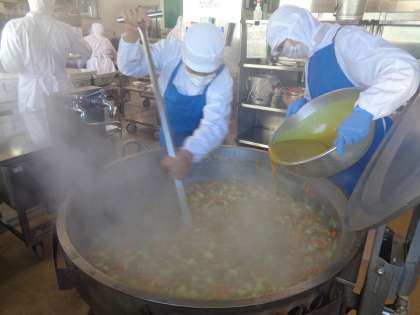 ルウが固まらないように、カレーをかき混ぜながら、ルウを少しずつ加えます。