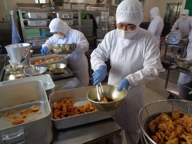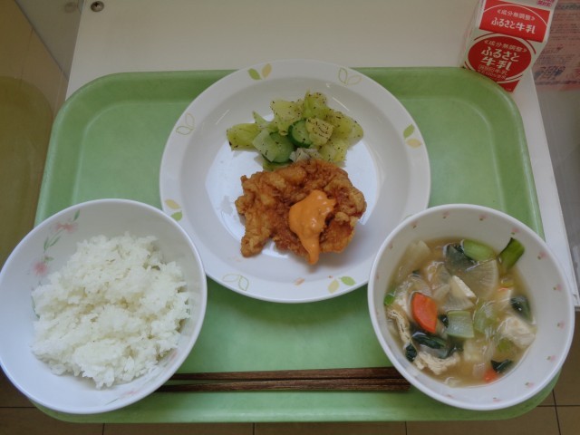 揚げた鶏肉を甘酢タレに絡めてバットに入れ、上からタルタルソースをかけました。