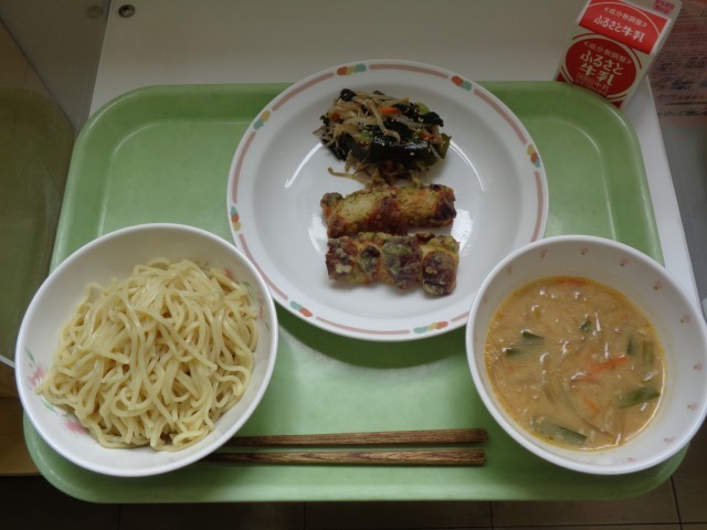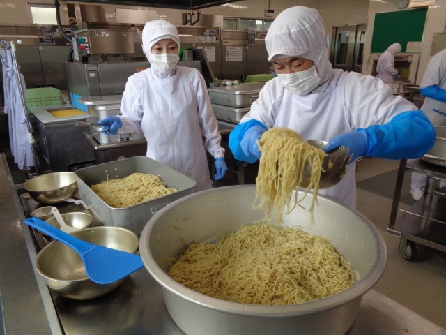 ゆでて水で冷やした麺に油を回してから、バットに入れています。