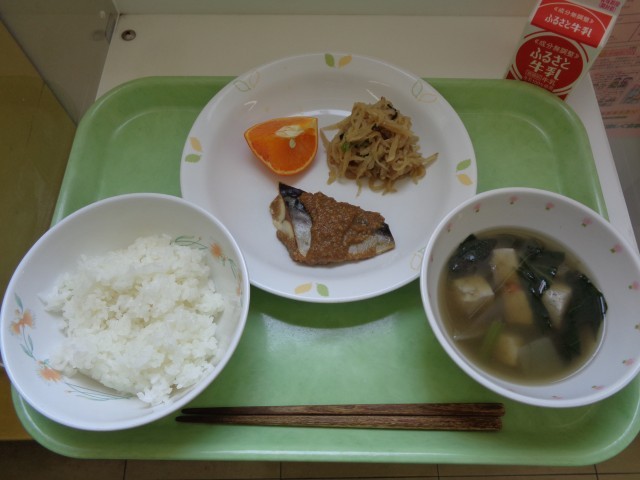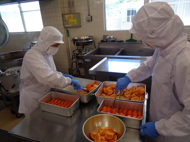 カットしたオレンジをクラスの食缶にきれいに並べながら入れています。