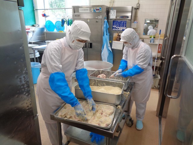 1枚1枚のお肉に水で溶いた小麦粉をつけ、さらにパン粉をまぶします。