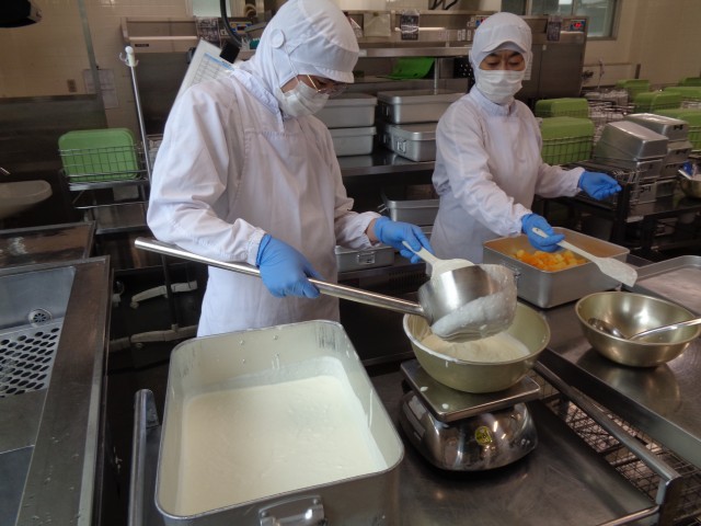今日は40パックのヨーグルトを異物が入っていないかチェックしながら食缶にあけました。