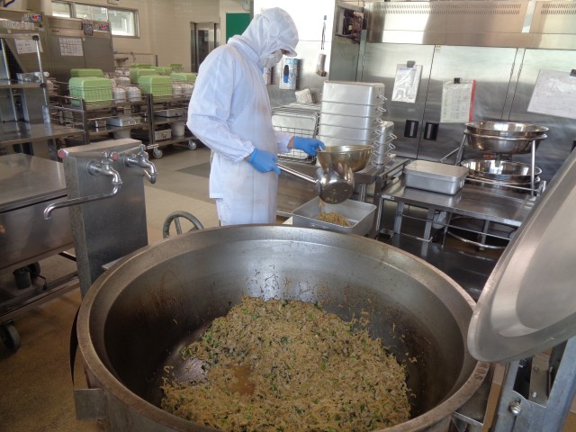 豚肉と切干大根の炒め物を配缶しています。