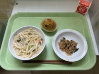 【献立】ちゃんこうどん牛乳豚肉と切干大根の炒め物抹茶小豆マフィン【今日の給食室】...