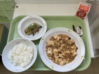 【献立】ごはん牛乳麻婆豆腐塩ナムル【今日の給食室】麻婆豆腐に使う豆腐を切っていま...