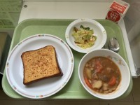 【献立】フレンチトースト牛乳豆入りポークシチューチーズ入りフレンチサラダ【今日の...
