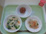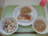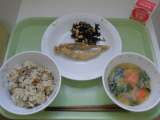 【献立】 五目ごはん 牛乳 具だくさんみそ汁 ししゃもの磯辺揚げ ひじきと大豆の...