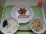 【献立】 玄米ごはん 牛乳 ひじきふりかけ あんかけ汁 鮭の塩焼き 大豆入り炒り...