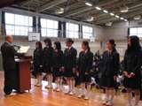 学校長から今月の目標の「公共心」について講話、バドミントン部区新人大会の表彰、薬...
