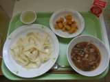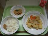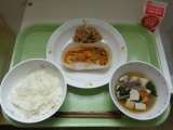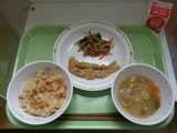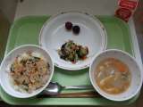 【献立】 卵入りチキンライス 牛乳 白いんげん豆のスープ チーズ入りフレンチサラ...
