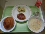 【献立】 黒砂糖パン 牛乳 コーンクリームスープ アップルチーズハンバーグ キャ...