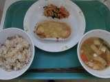 今日の給食は、麦ごはん、牛乳、豆乳入りみそスープ、鯖のカレー南蛮揚げ、海藻サラダ...