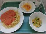 今日の給食は、トマトクリームスパゲティ、牛乳、キャロットサラダ、チーズケーキです...